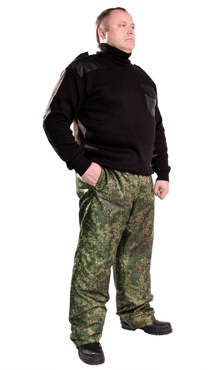 Зимние брюки на притачном поясе, стянутом эластичной тесьмой, и карманами с отрезным бочком. Брюки утеплены двумя слоями синтепона, под коленом - одним слоем. Рекомендуемые материалы: смесовые ткани и плащевые ткани с пропиткой ВО. ГОСТ 29335-92.